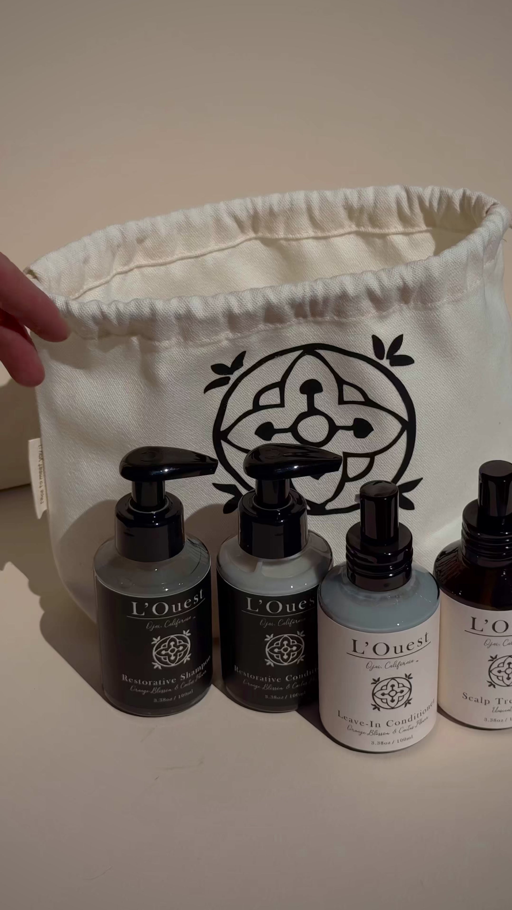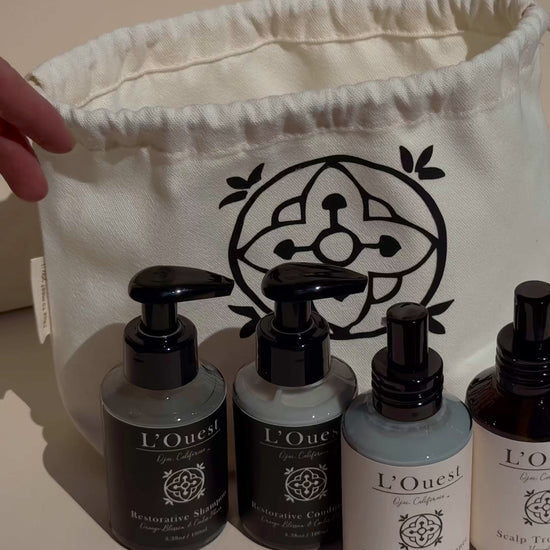 Discover the full L’Ouest ritual in a travel-ready size. Our Starter Set includes all four essentials—Restorative Shampoo, Restorative Conditioner, Leave-In Conditioner, and Scalp Treatment—tucked inside a soft canvas drawstring bag.